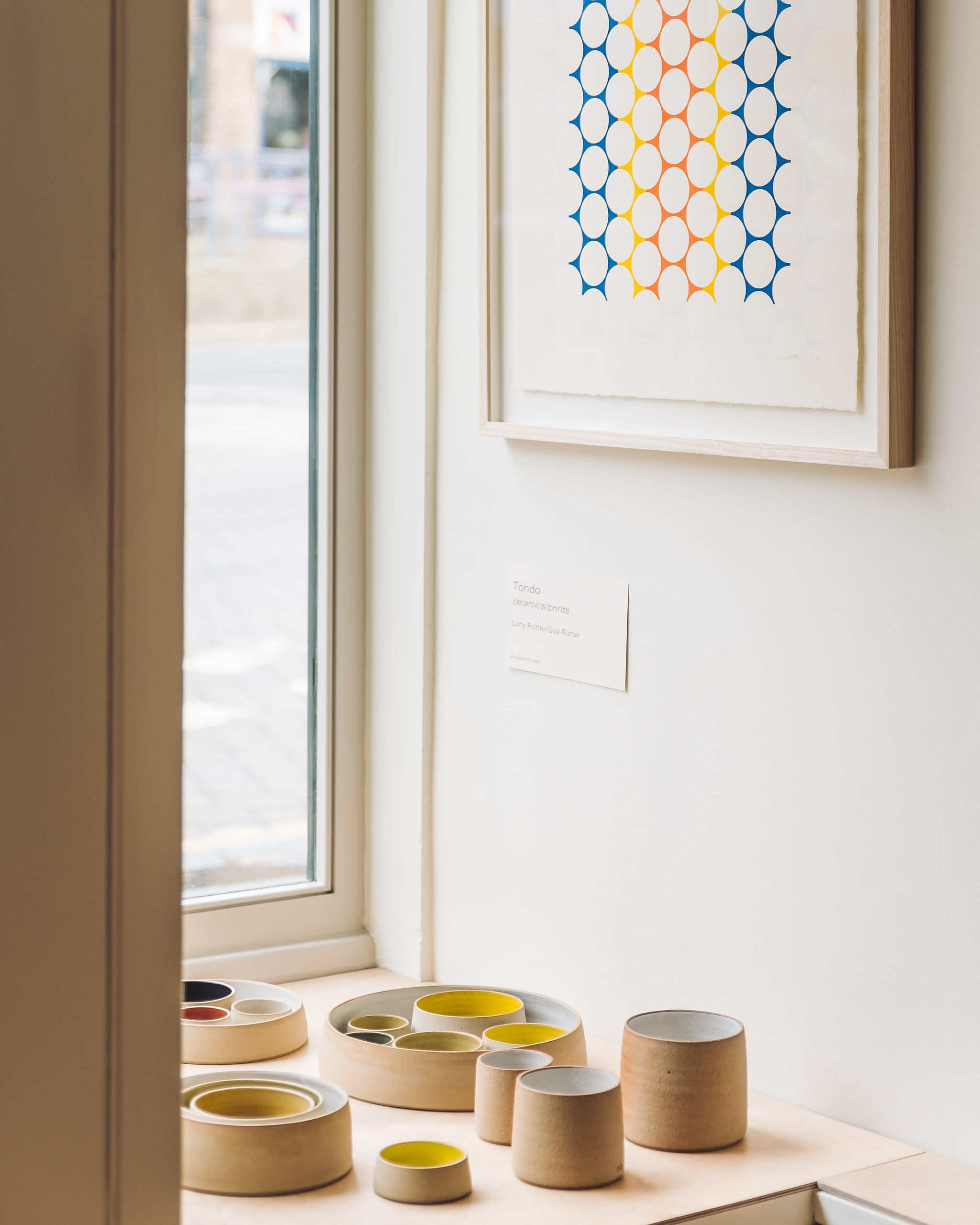 Lucy and Guy have worked together on these pieces hoping to echo form and colour in both prints and pots, each inspired by the other’s work. The title of the show, Tondo, is a Renaissance term for a circular work of art, either a painting or a sculpture. Here it refers to the use of round forms in both Guy’s works on paper and in Lucy’s ceramics.