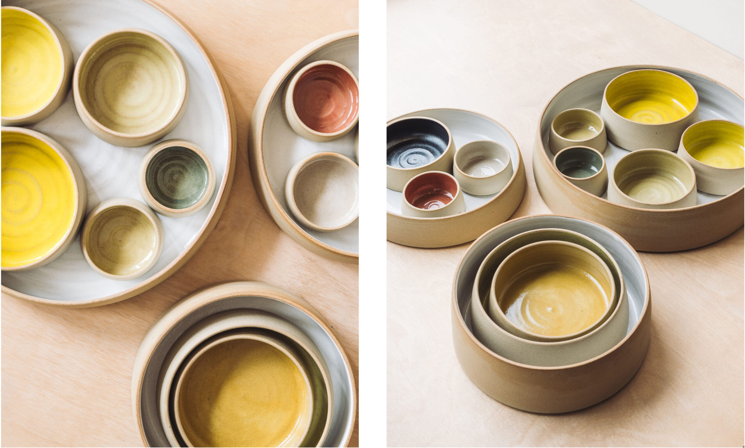 Lucy has been developing quite an extensive collection of hand-made glazes for the works, mixing and creating small glaze tests in order to create a new palette of colours on the simple nesting straight-sided forms she has been making for some time. Unglazed on their outside, the colour pools on the inside of the pieces.