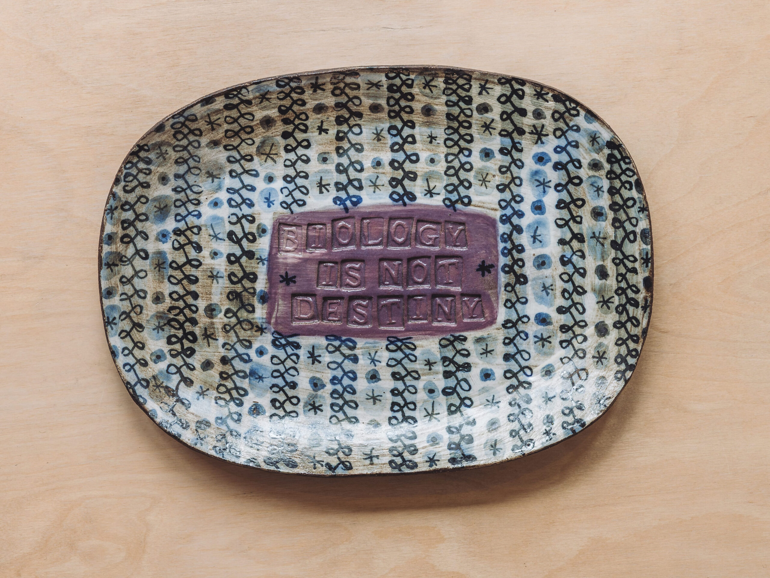 Unique hand-moulded platter ‘Biology Is Not Destiny’; a quote by Simone de Beauvoir, impressed with letter stamps that have been designed and hand-carved by the artist from clay. Glazed stoneware, white and crank clay, oxides, and slip decoration to front. Measures 280mm in width, 205mm across. Adhesive D-ring attached for wall hanging option.