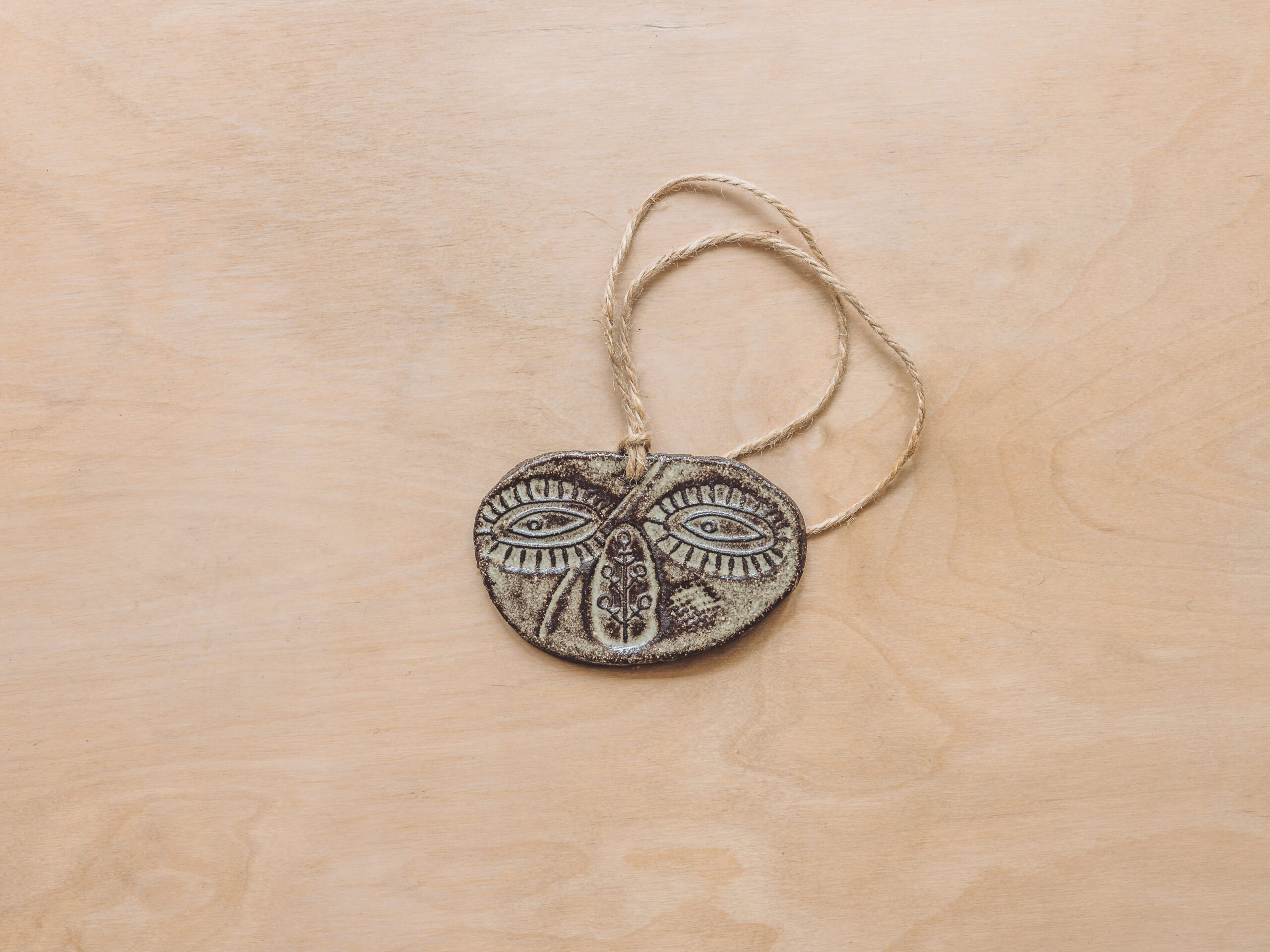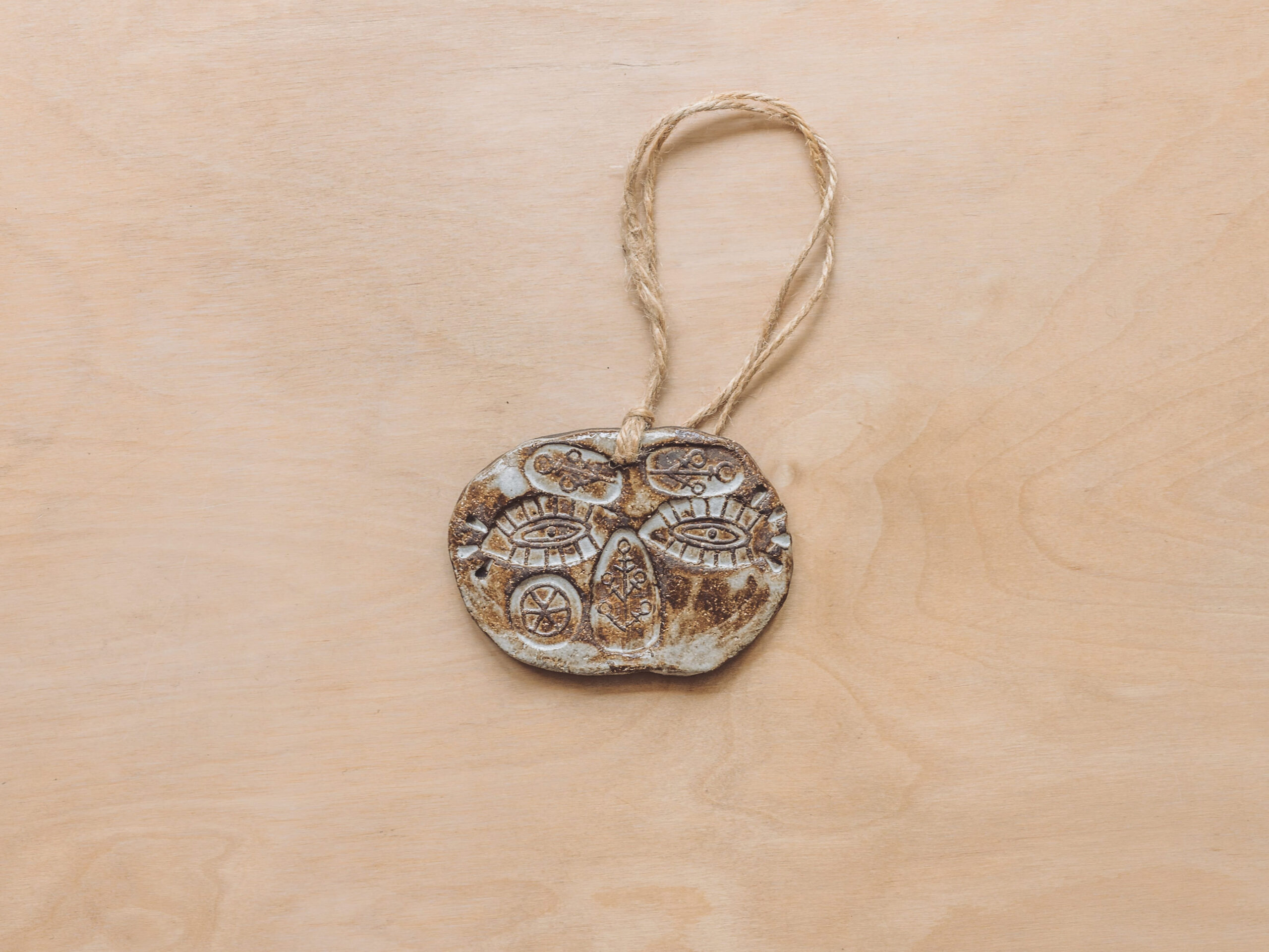Unique hand-moulded and impressed glazed stoneware genderqueer deities.  Glazed stoneware, measuring approximately 95mm in width, 70mm across, with a pierced hole for hanging.