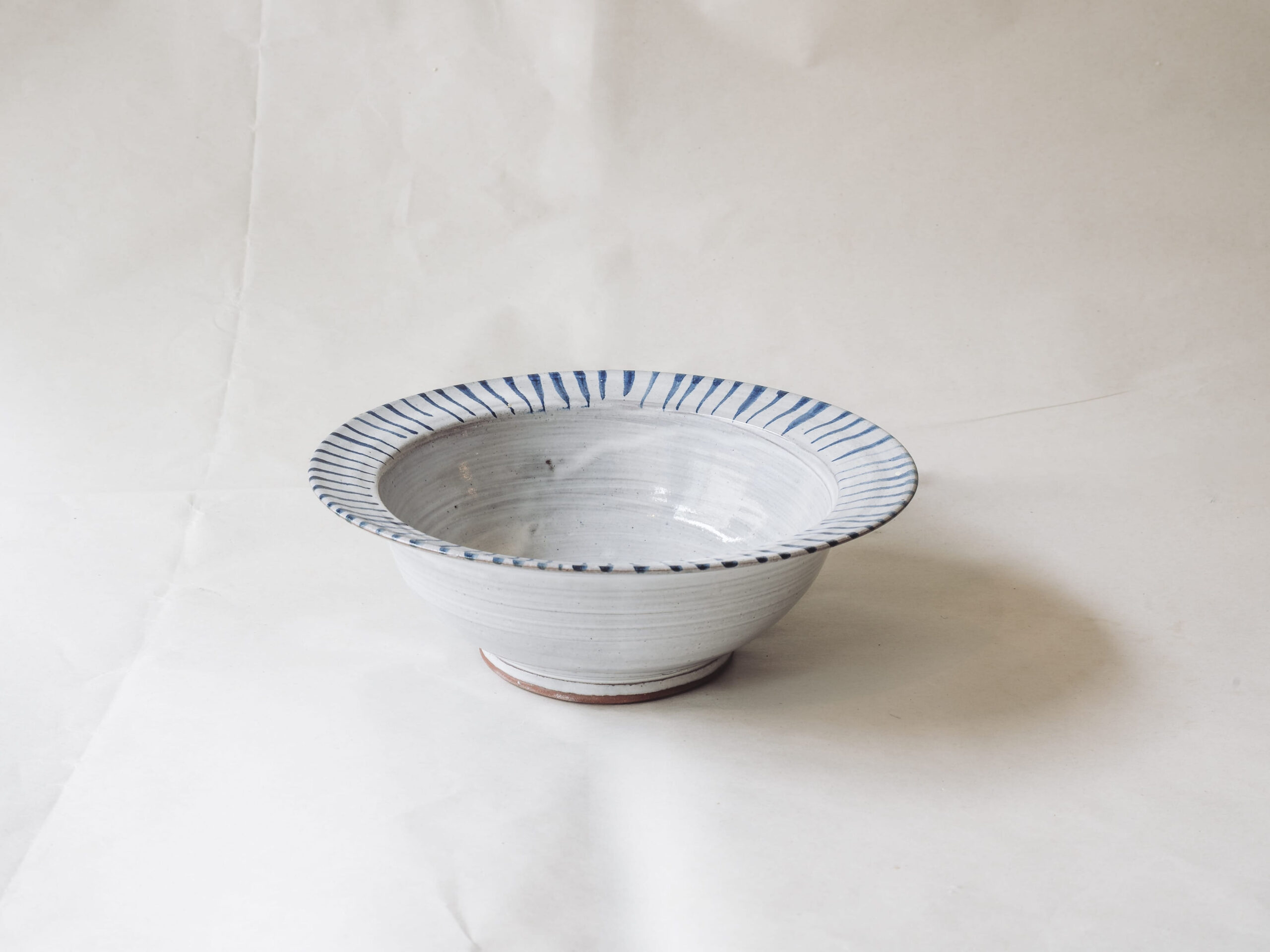 Terracotta earthenware bowl, fired with cobalt oxide over tin white glaze, measuring 190mm across, 70mm high.
