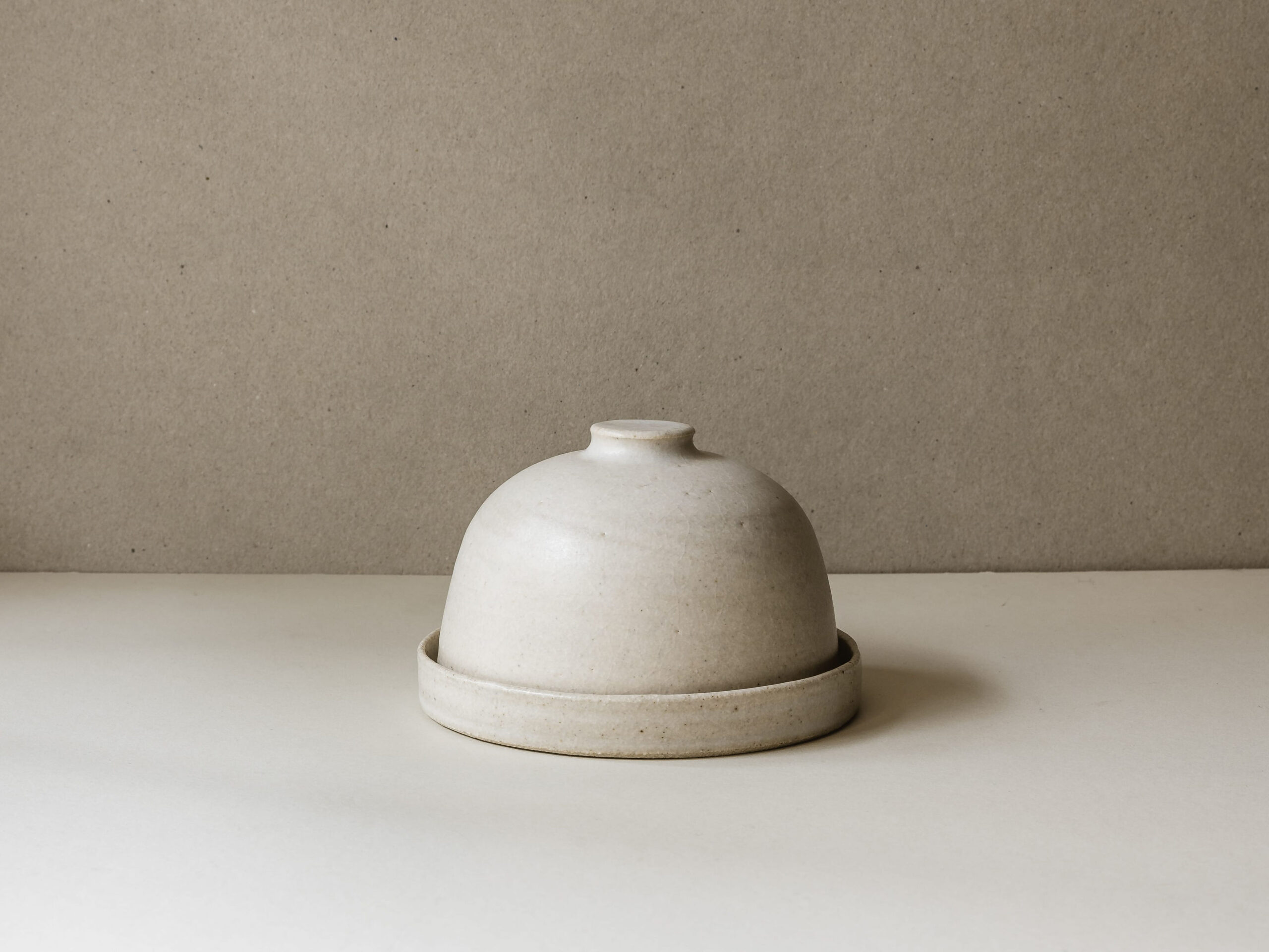 Hand-thrown stoneware butter dish, dolomite glazed in an electric kiln. Diameter approximately 130mm, height 85cm. Made in Kent.