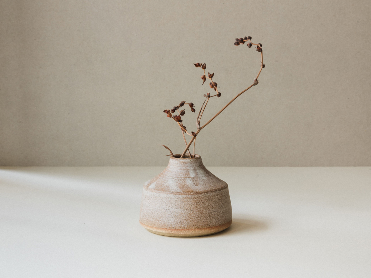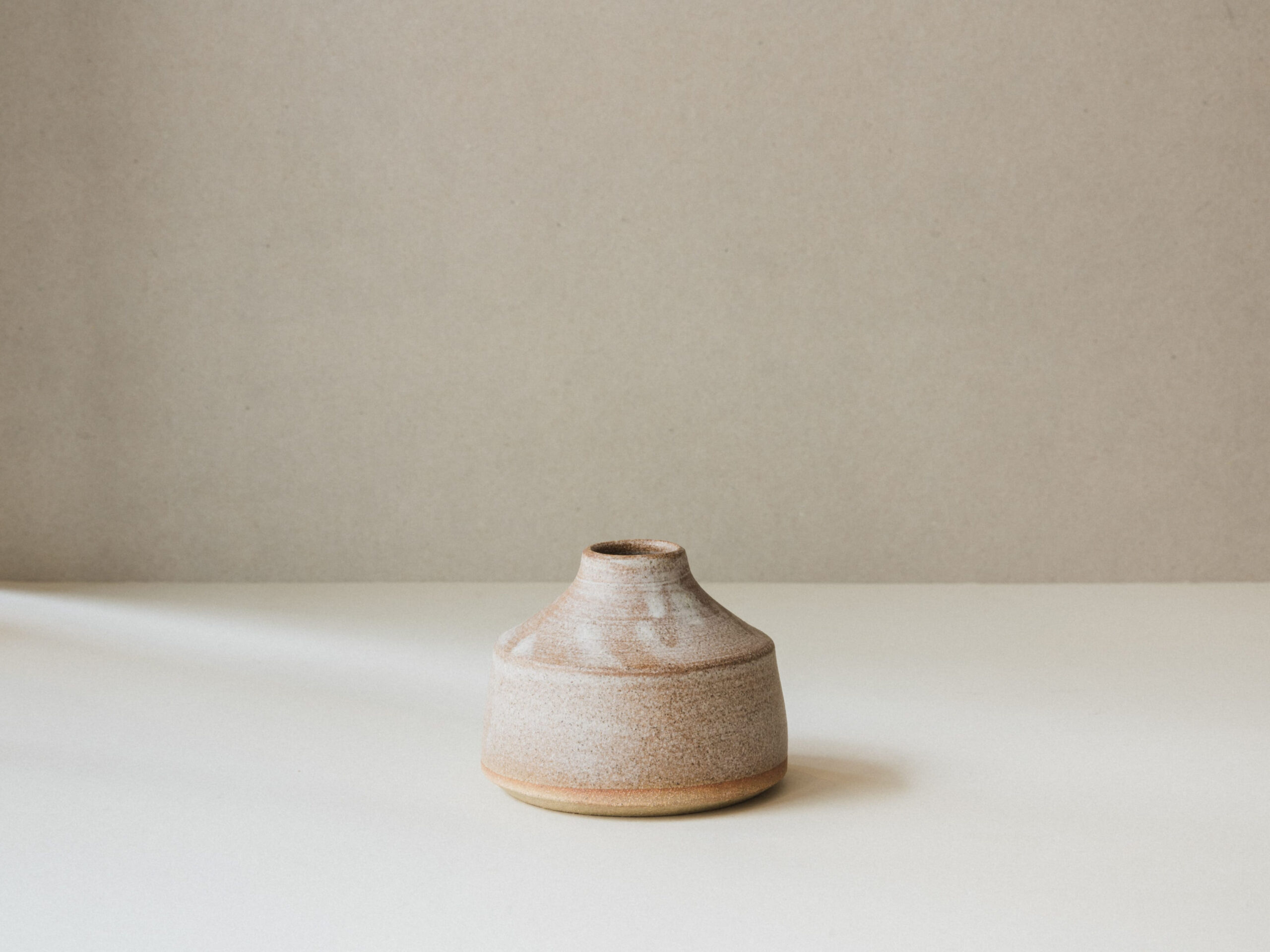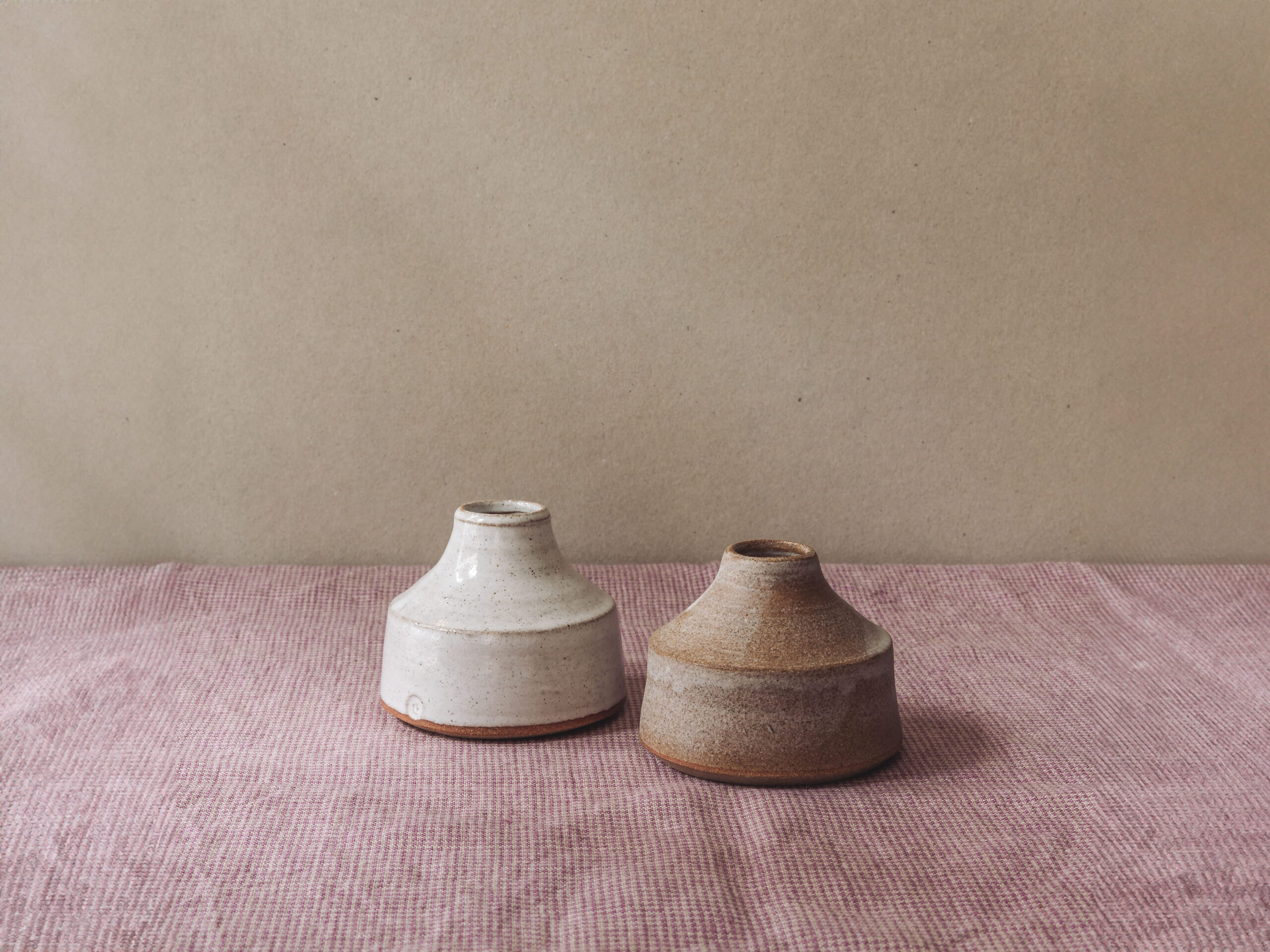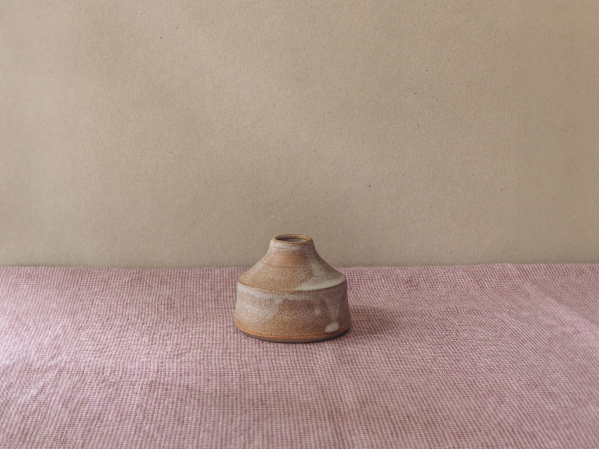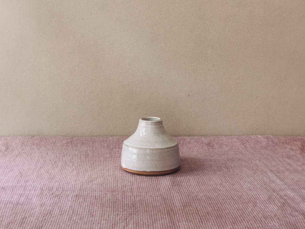 Hand-thrown stoneware bud vase or ink well in tin white or milk white glaze. Diameter of base 75mm, height 70mm. Made in Kent. Available to purchase with a pair of 100% British beeswax dining candles.