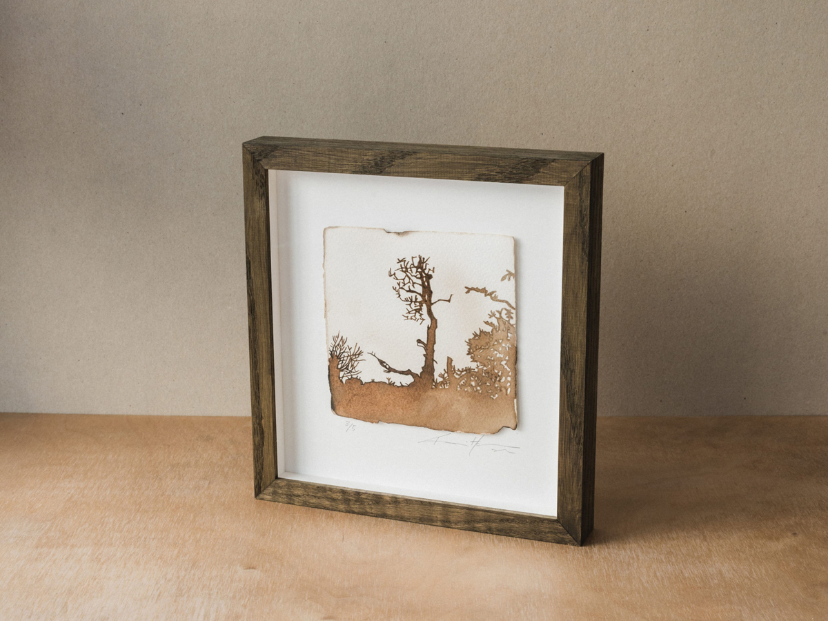 Fire Etching—Aburidashi on Somerset paper. Framed in a stained oak frame, signed on the mount, edition 3/5, glazed with anti-reflective Art glass protecting the artwork by providing 70% UV protection. Artwork size measures 120mm x 125mm, frame size 220 x 235mm. Also available unframed float-mounted on board, signed and numbered 4/5, size of mount 200 x 255mm, artwork size 120mm x 125mm.