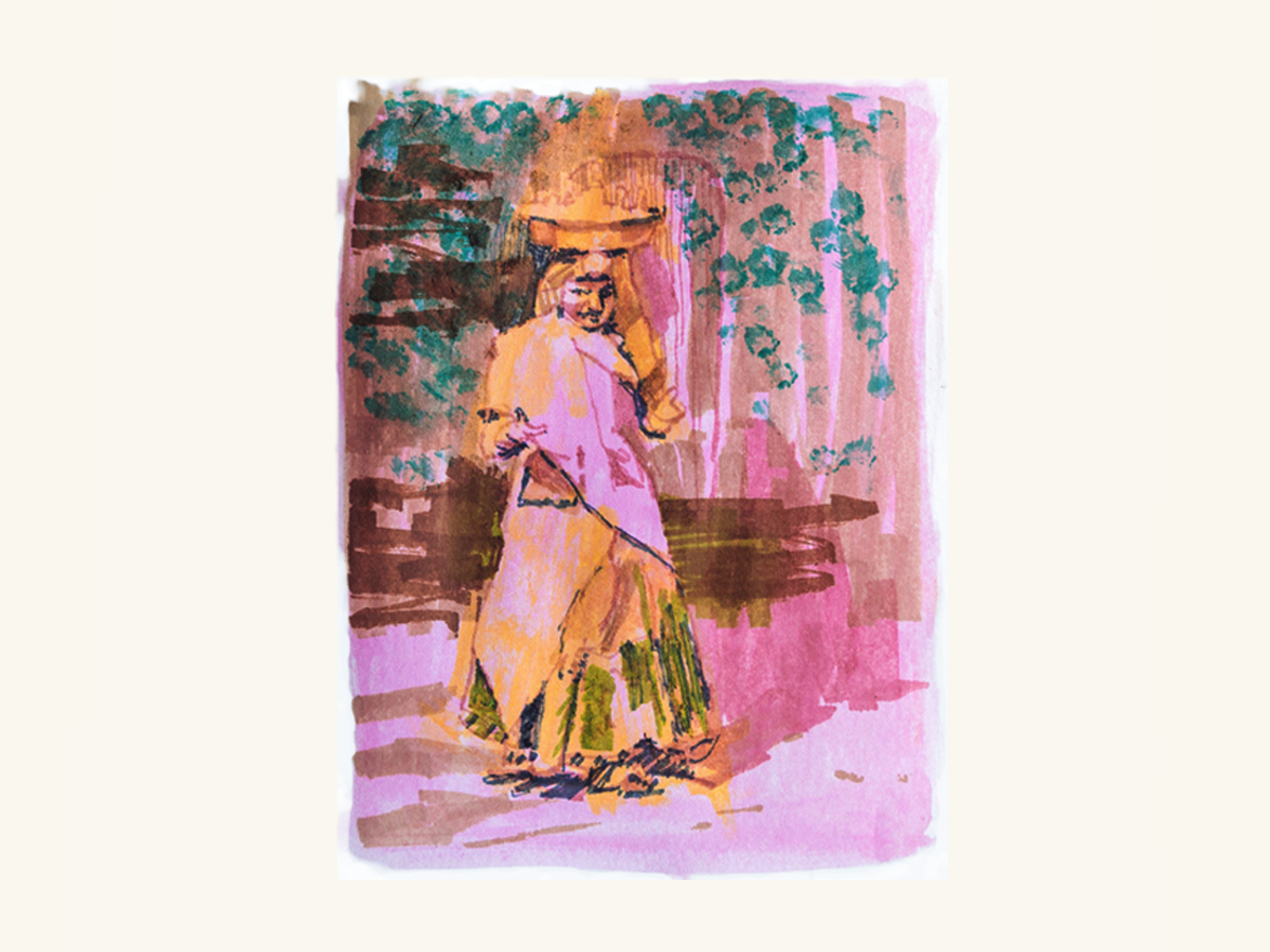 Original artwork in felt tipped pens, signed and dated on reverse.  Based on women featured in early National Geographic travel guides. Size  160 x 220mm.