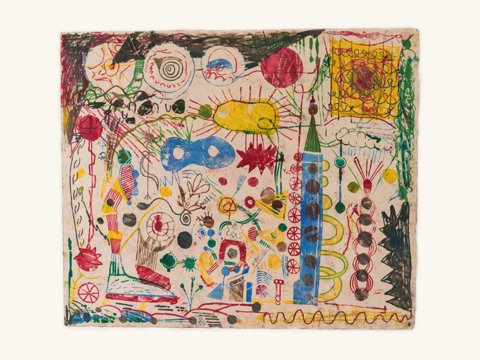 Monoprint (with the drawing on the reverse of the paper) using oil-based pastels on Kitakata 110gsm handmade Japanese paper with a deckle edge. Size 520 x 440mm.