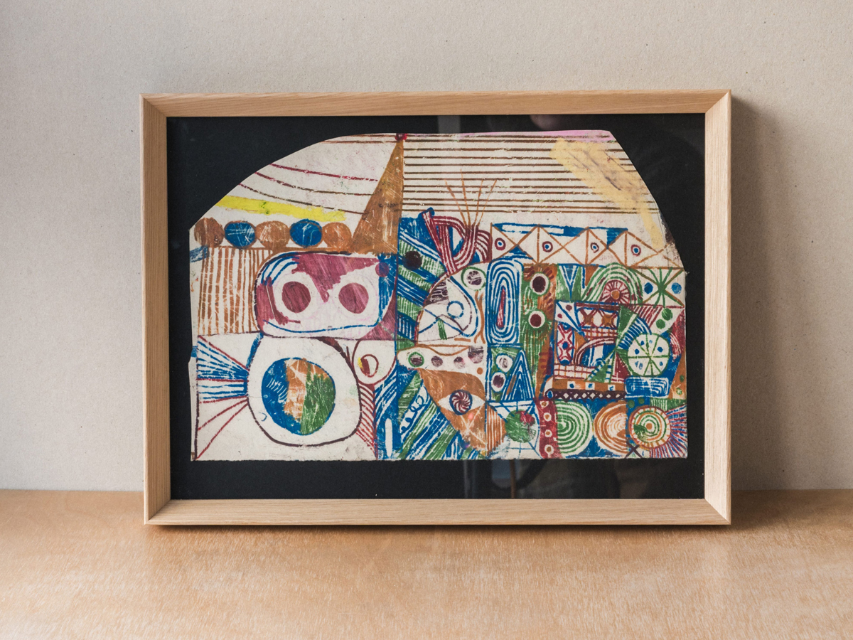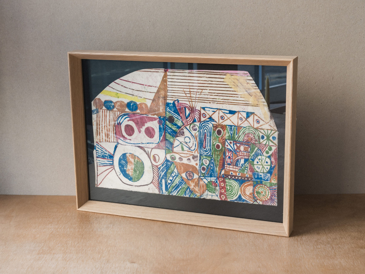Monoprint (with the drawing on the reverse of the paper) using oil-based pastels on Kitakata 110gsm handmade Japanese paper with a deckle edge. Framed in a bevelled-edge oak frame, mounted and glazed, artwork size 305mm wide x 200mm tall, frame size 350mm wide x 255mm tall x 30mm deep.