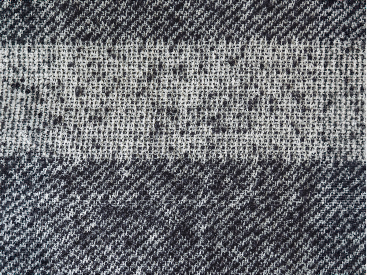 Mohair gives a visual effect of distortion of the surfaces, and the rhythmic patterns both reveal and conceal the woven structure behind the fog mohair effect. The result is a luxurious, structural blanket with a unique, tricot pattern that conveys a feeling of both simplicity and elegance. The cream yarn is natural, undyed lambswool.