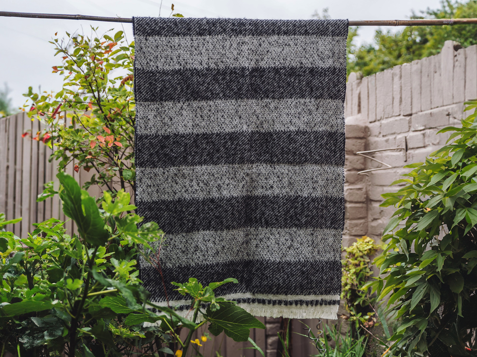 Woven in England. Materials: 84% lambswool (33% merino), 13% mohair and 3% nylon, measures 70cm x 190cm.